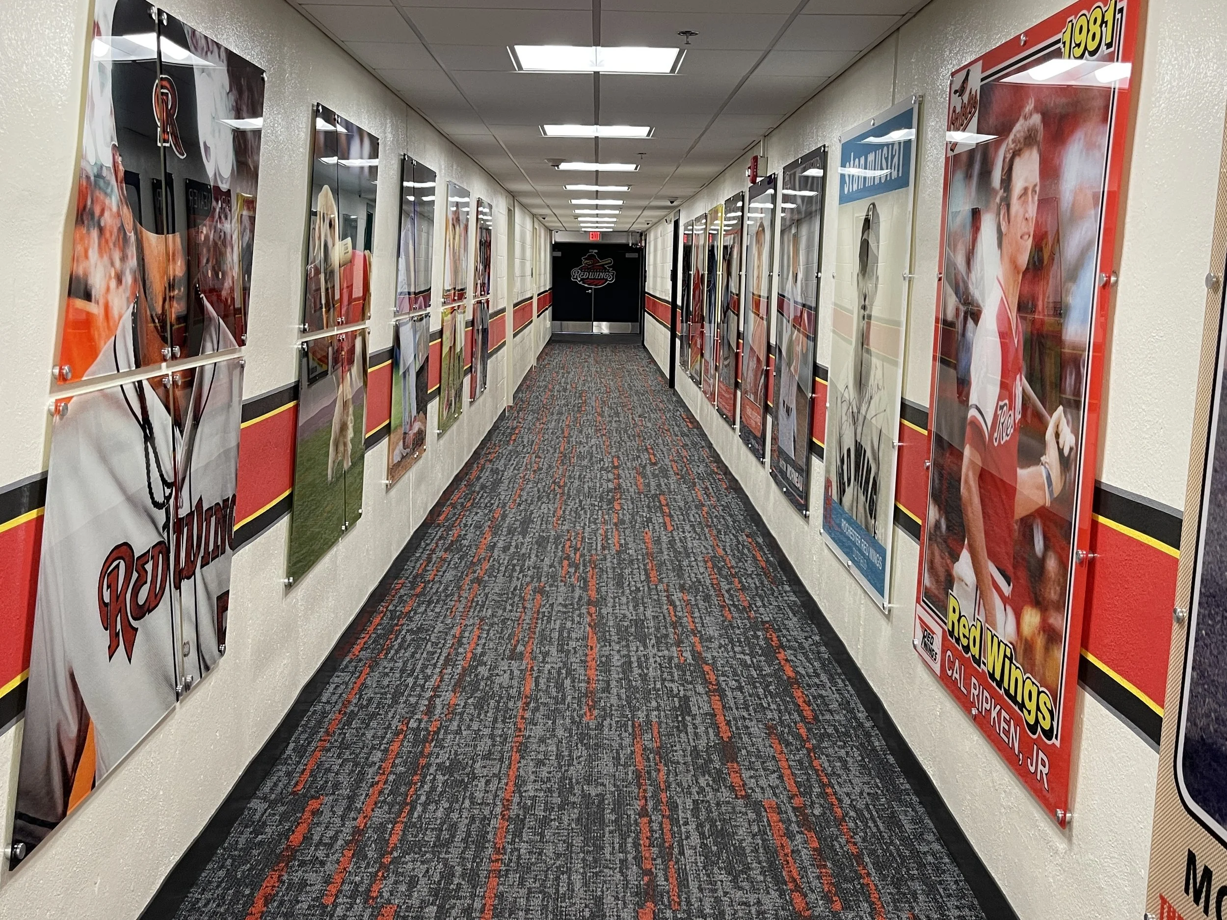 The transformed clubhouse now features a striking formal entrance, adorned with dimensional team logos that set the stage for an immersive experience. Inside, an illuminated overhead logo adds a bold visual centerpiece to the locker room, while oversized replica player cards pay homage to some of the greatest athletes in Red Wings history. Expansive murals further celebrate key moments from the team’s nearly 150-year legacy, creating an inspiring atmosphere for both players and staff.