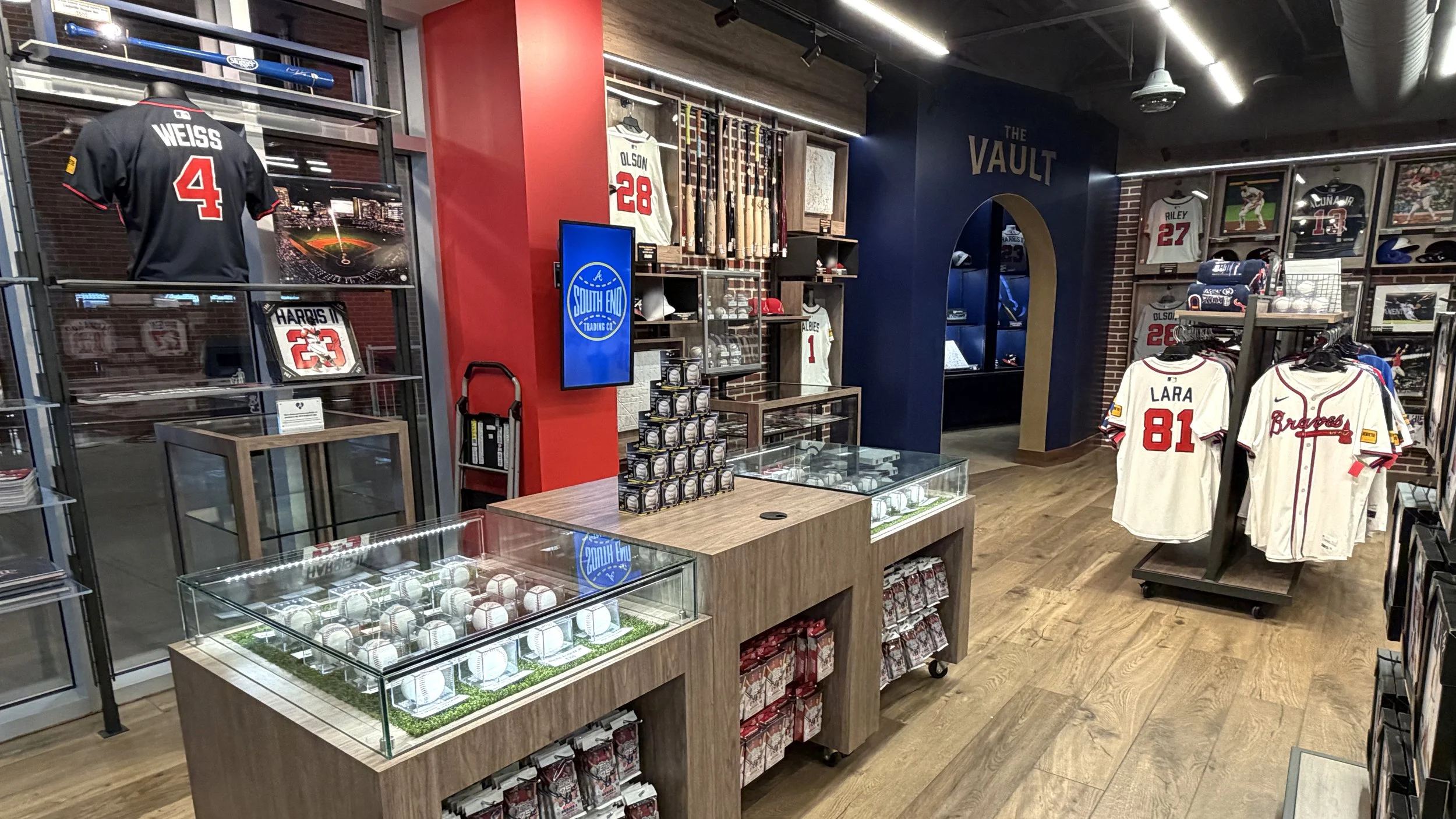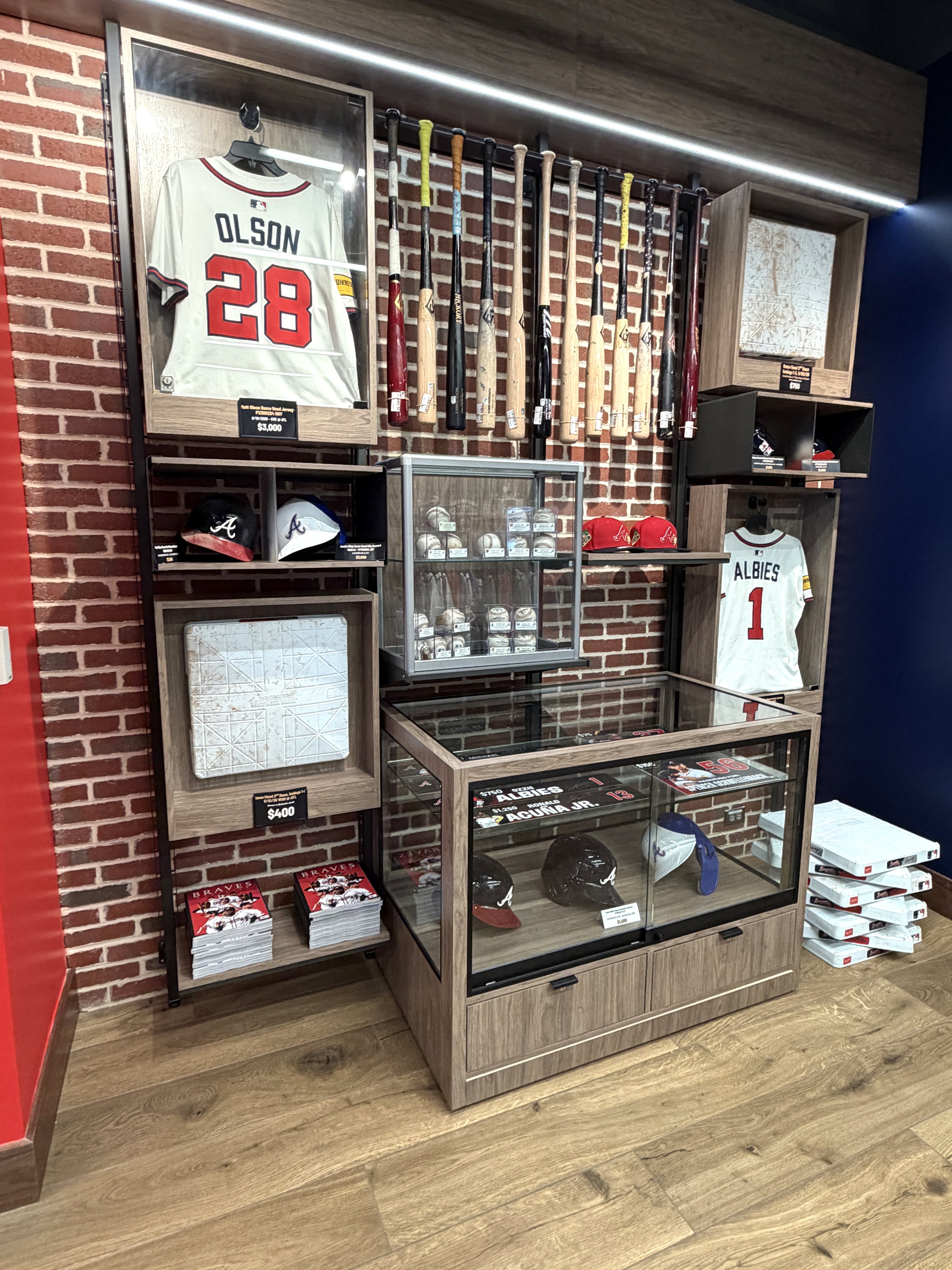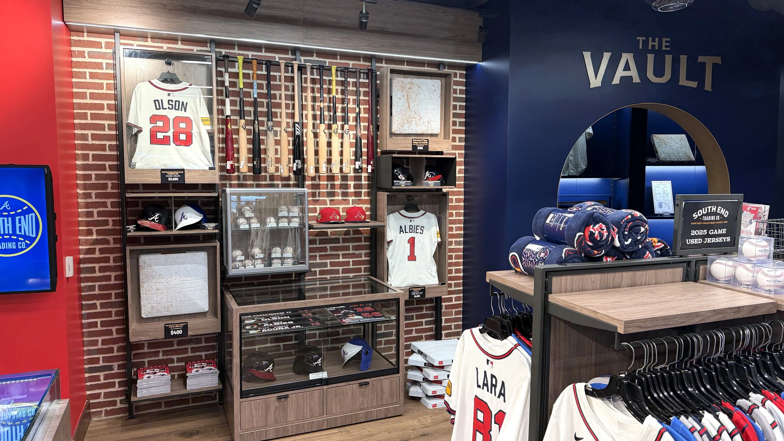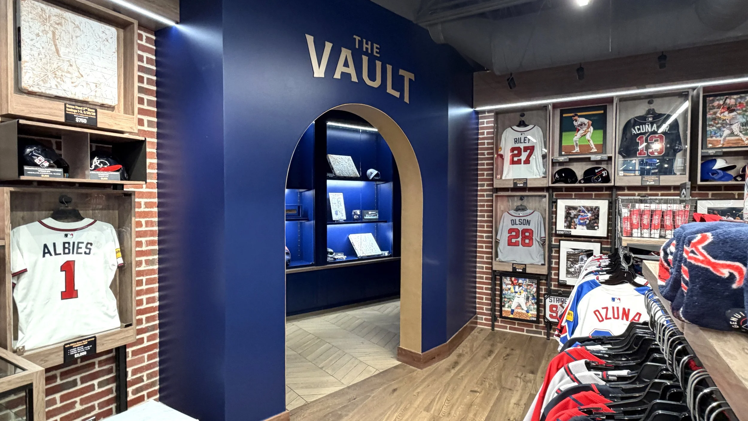 The design emphasizes openness, clarity, and curated discovery, allowing fans to move fluidly through the space while engaging with product in a more intentional and elevated way. A defining feature of the space is The Vault—a dedicated, museum-like archive showcasing the Braves’ most coveted and historic collectibles. Designed as a focal point within the store, The Vault elevates game-used memorabilia into a storytelling experience, reinforcing authenticity while creating a sense of rarity and exclusivity that resonates with collectors and casual fans alike.